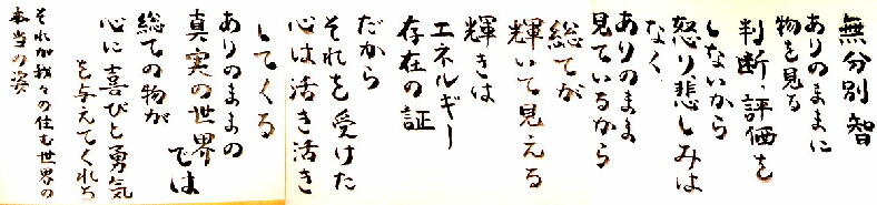ありのままに見る![]() ありのままに見れば、すべてはエネルギーからできている。 だから、すべてのものが光り輝きます。 すべての出来事が光のうねりとして映ります。 すべてがエネルギー それは心の元気の素 だから、それを見れば心は活き活きしてくるのです。 でも、それは「私の心」がそれを見ているから。 本当はその心もエネルギーのうねりの影 エネルギーのうねりとは「業 カルマ」 だから、それを喜んでいるうちはカルマは解消されないのです。 ちょっとした弾みで、ありのままに見ることができなくなり、 判断・評価・レッテル貼りを始めて、 人は苦しみや怒りや悲しみの感情に飲み込まれます。 だから、その心の元となる、エネルギーのうねりも解消しなければ 本当の静寂は訪れません。 カルマが解消されたとき、あなた自身が完全に消滅するのです。 それこそが本当の静寂 輪廻からの解脱です。 |
